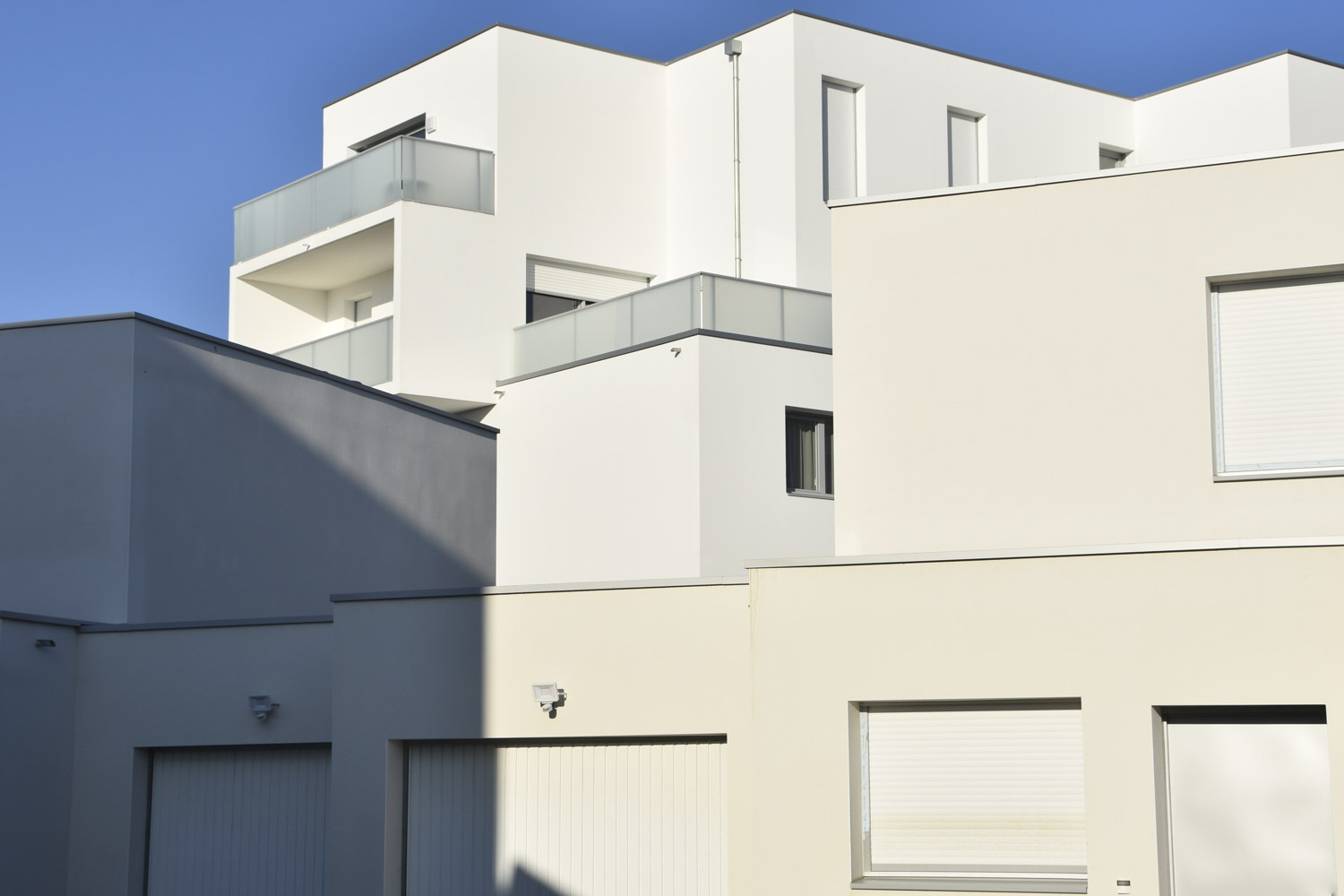 L’organisation du plan masse oriente l’implantation de l’immeuble à l’Ouest et les maisons en bande au Sud de la parcelle. Cette organisation permet d’éviter les vis-à-vis du collectif et des maisons individuelles ainsi que l’immeuble de logements déjà construit sur la parcelle.