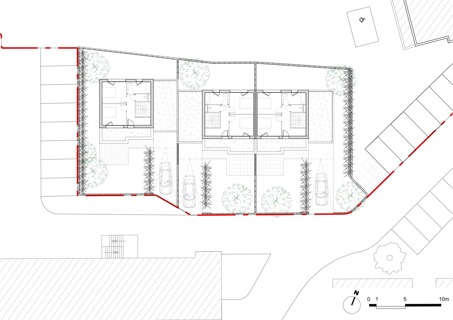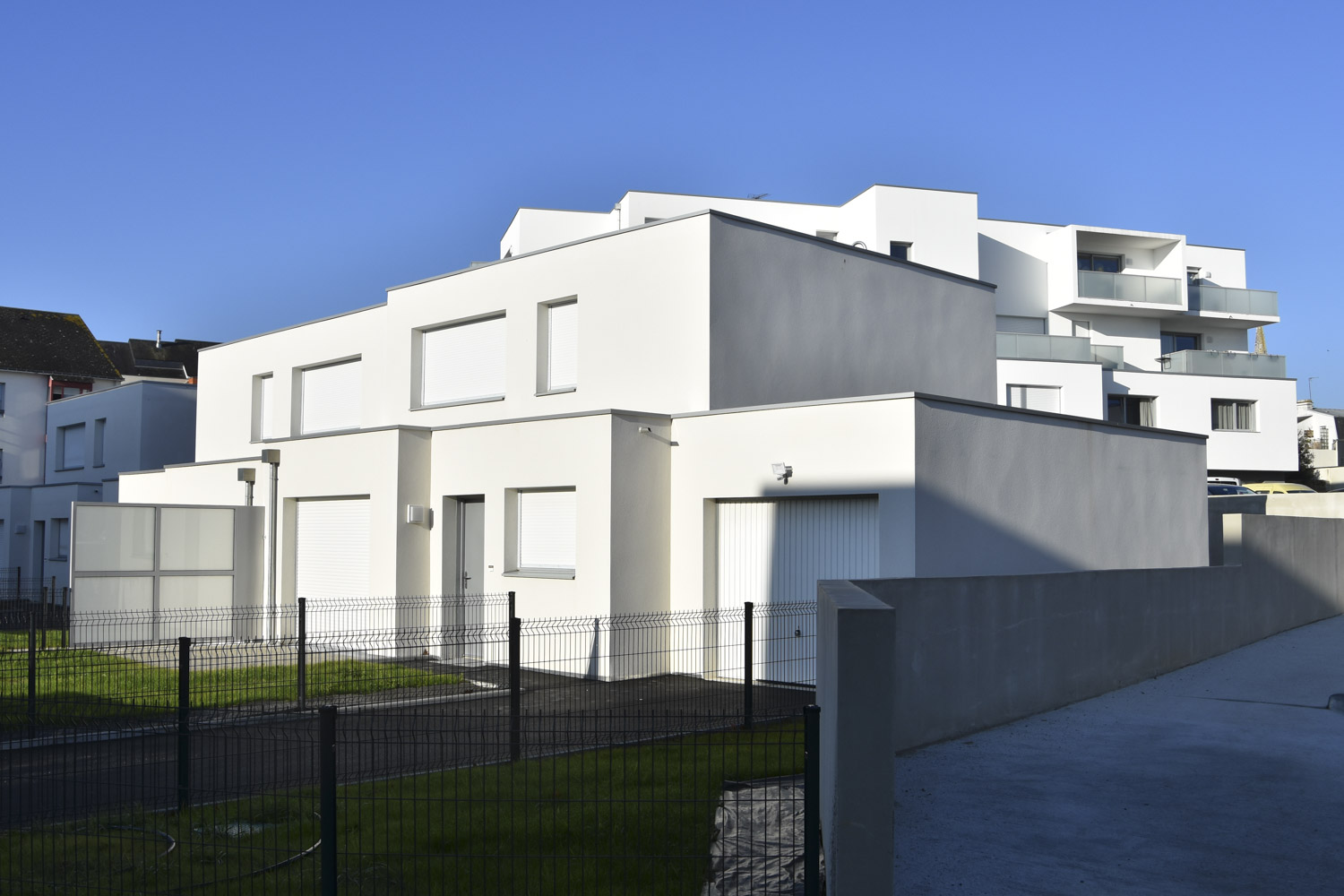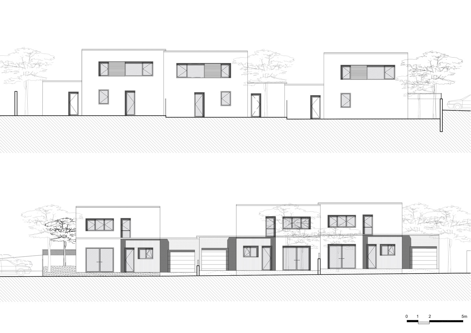 Les 3 maisons individuelles s’élèvent sur un rez-de-chaussée et un R+1. Ces constructions sont implantées en recul de la voie, permettant ainsi le stationnement des véhicules et l’accès au garage. Chaque maison est composée d’un engazonnement au Sud afin de créer des jardins privatifs et des terrasses.