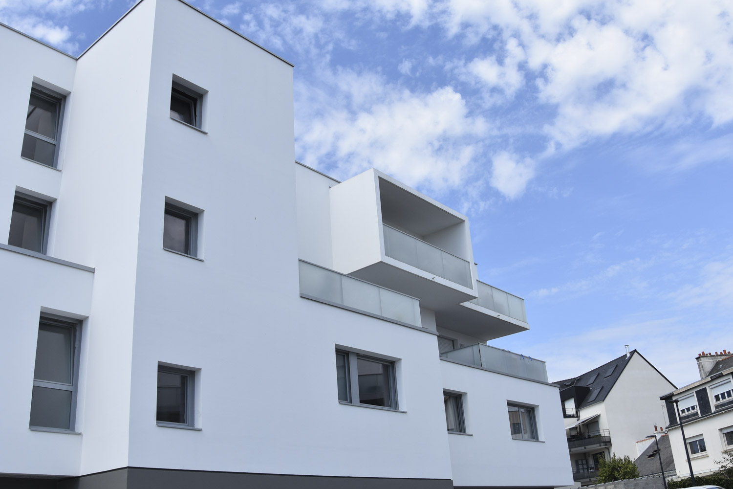 Le rez-de-chaussée, formant socle, abrite les pièces de vies communes et salles d’activité. Les façades du 1er étage sont rythmées régulièrement par les ouvertures des chambres de l’IME. Alors que les R+2 et R+3 abritant les logements sociaux offrent une lecture différente par la volumétrie : retrait des façades, balcons, loggias.