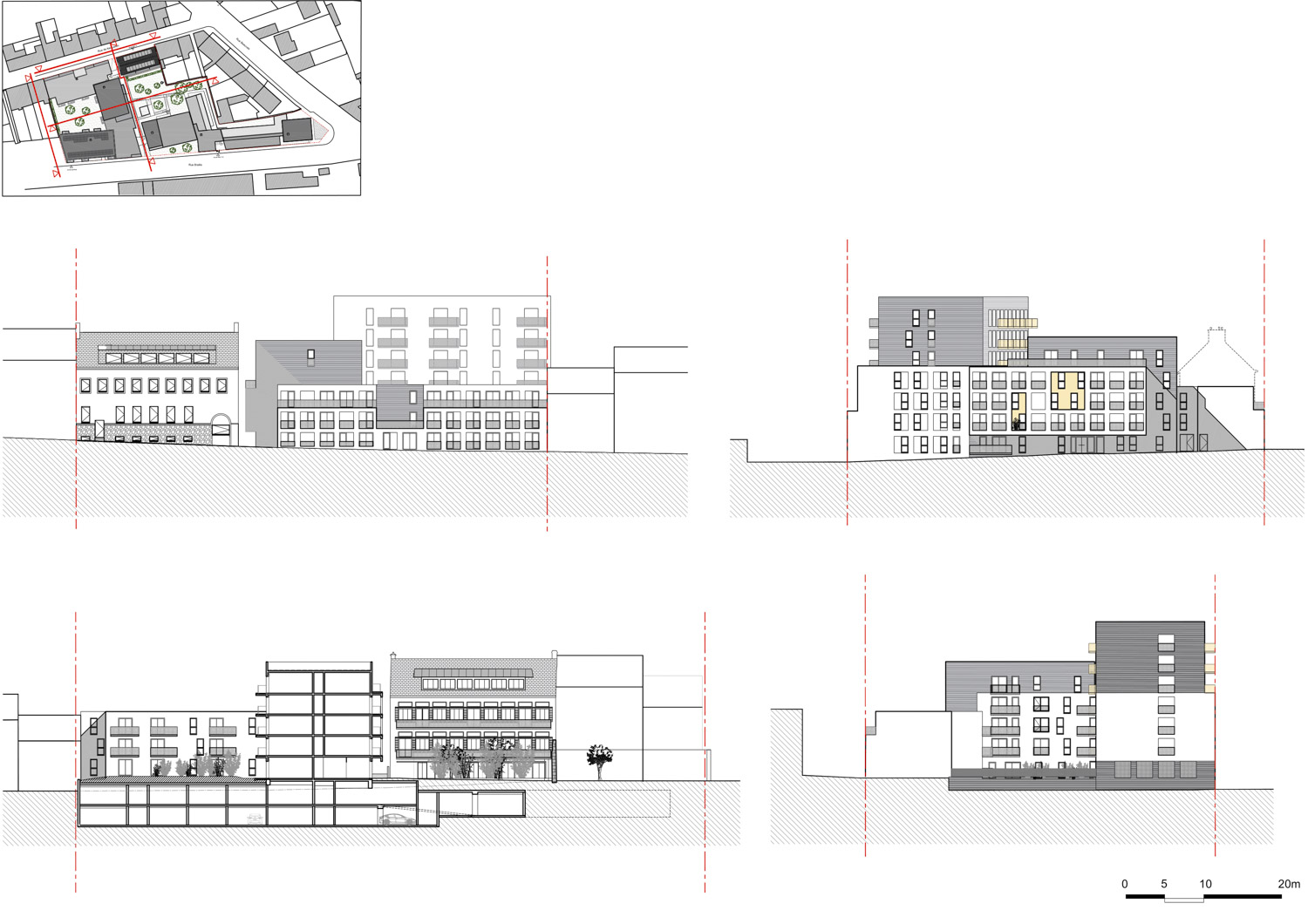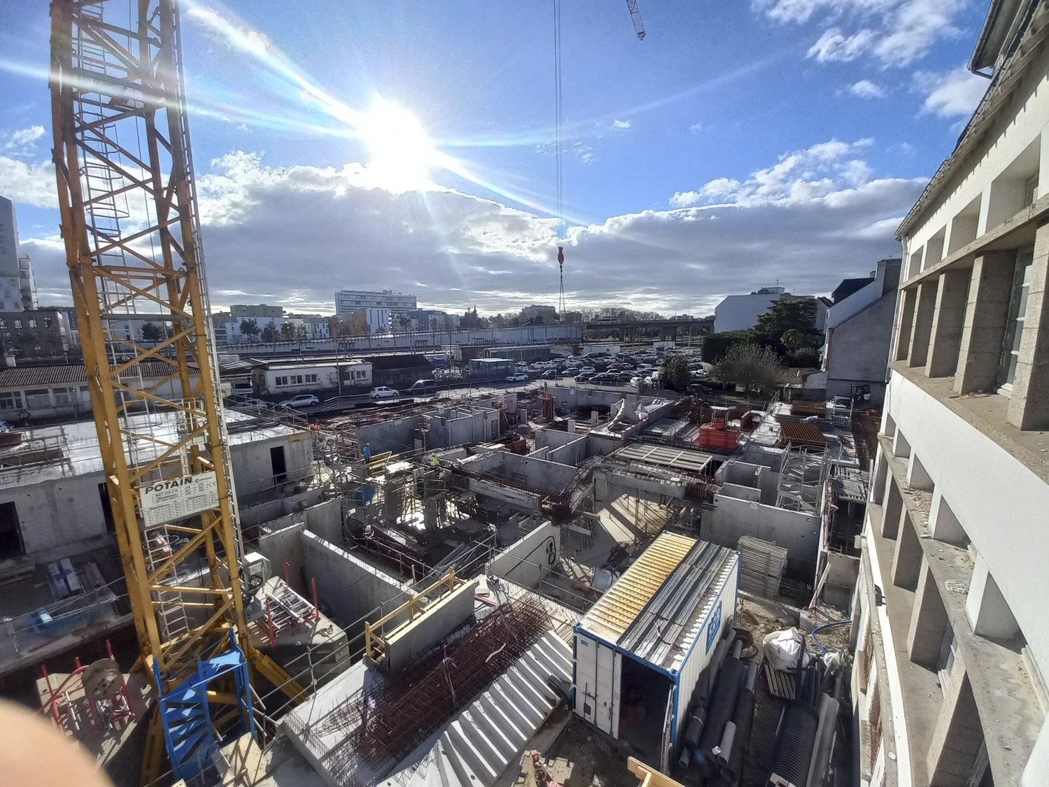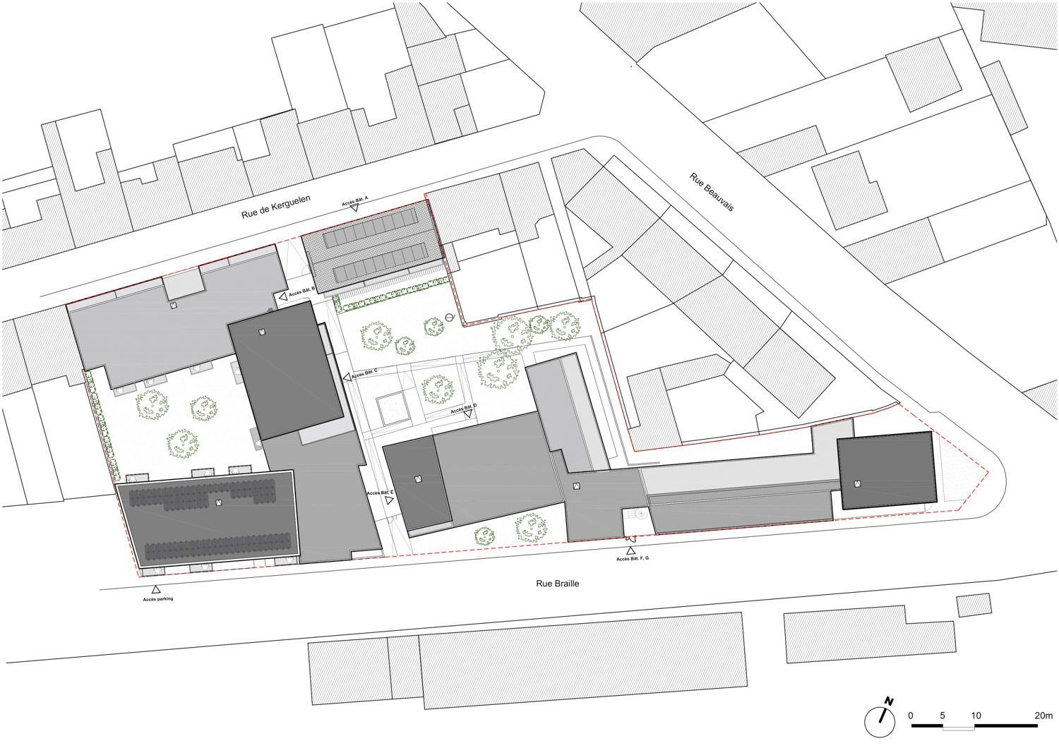 L’écriture architecturale privilégie des volumes sobres et rythmés, pensés à une échelle humaine. Les hauteurs des bâtiments s’adaptent aux gabarits alentour, assurant une transition fluide entre les différentes typologies urbaines du quartier. Au Nord, le tissu est principalement résidentiel, composé de maisons individuelles en R+1 ou R+2. En façade sur la rue de Kerguelen, les bâtiments A (conservé et réhabilité) et B conservent l’échelle de la rue s’élevant seulement en R+2 afin de préserver l’homogénéité de la rue.