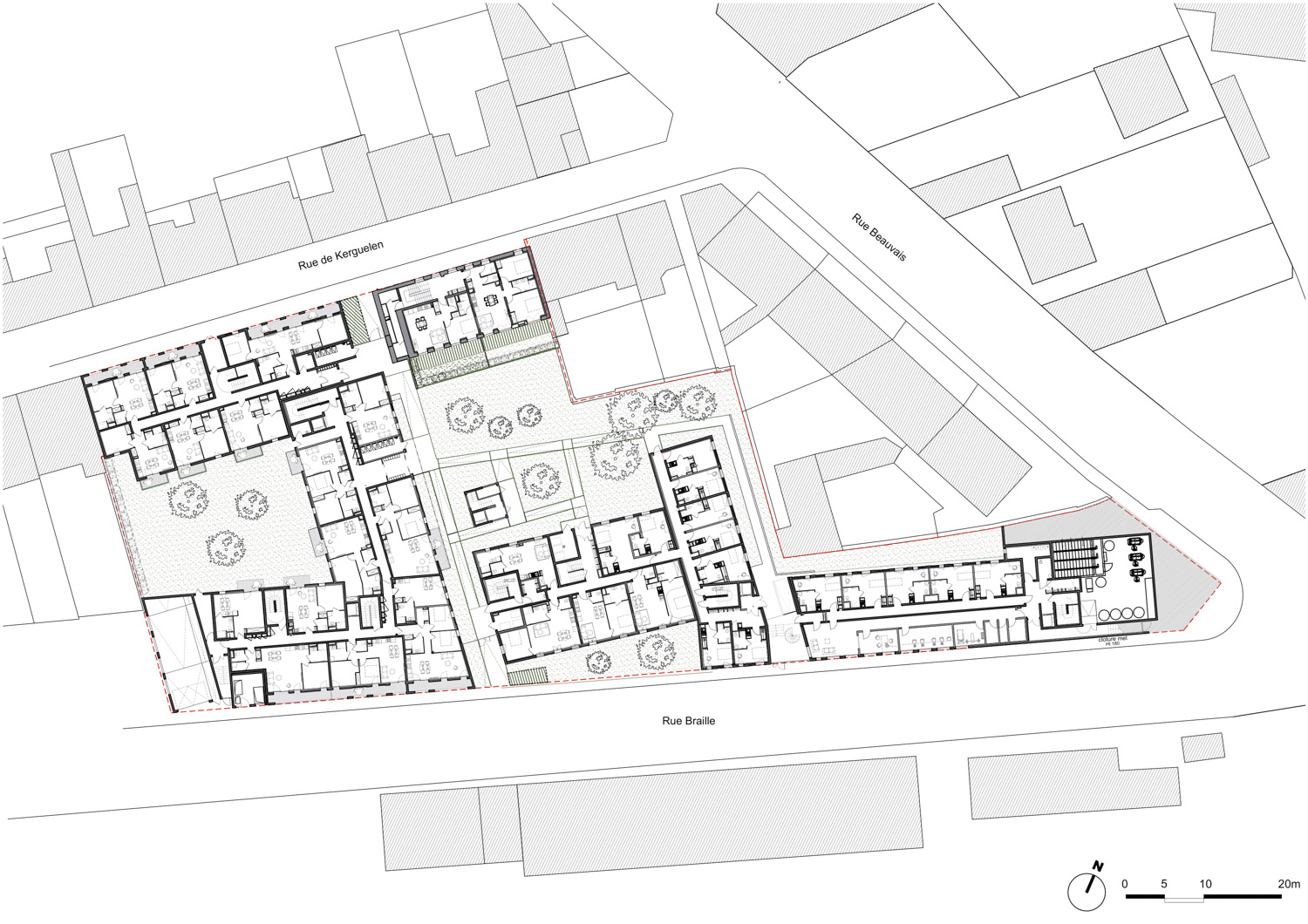 La disposition des bâtiments favorise les liaisons douces et crée une porosité avec le tissu urbain environnant. Une traversée piétonne Nord-Sud relie la rue Braille et la rue de Kerguelen, assurant une continuité piétonne à l’échelle du quartier. Les véhicules sont quant à eux cantonnés aux 2 niveaux de sous-sol, garantissant un îlot entièrement libéré de la circulation automobile.