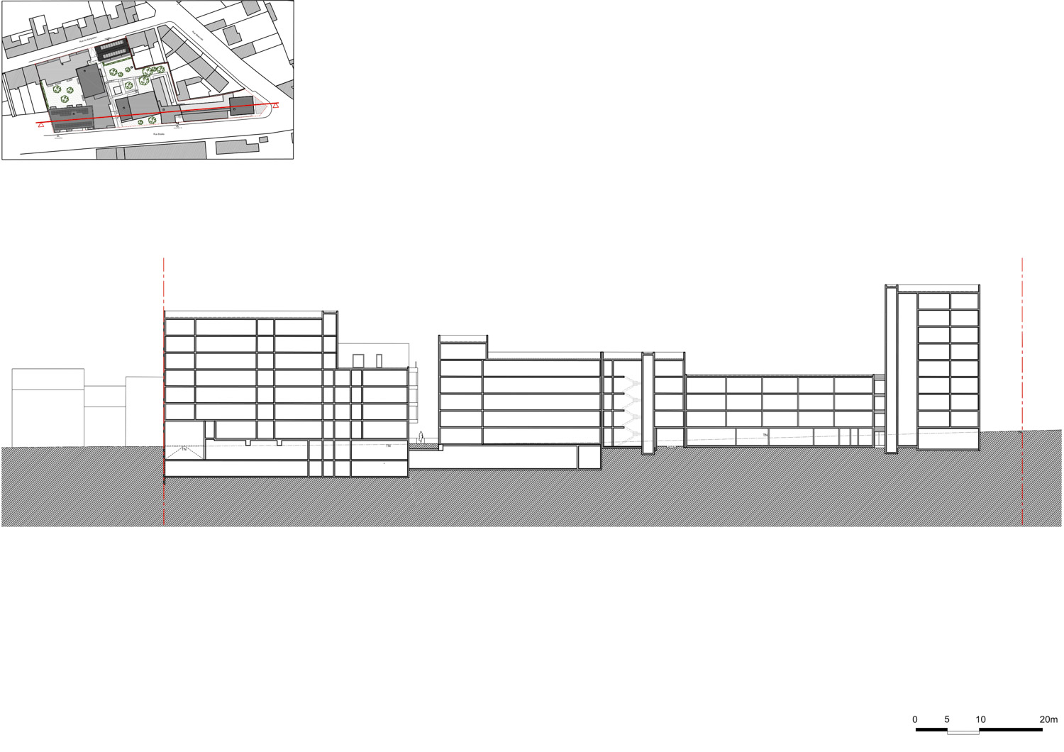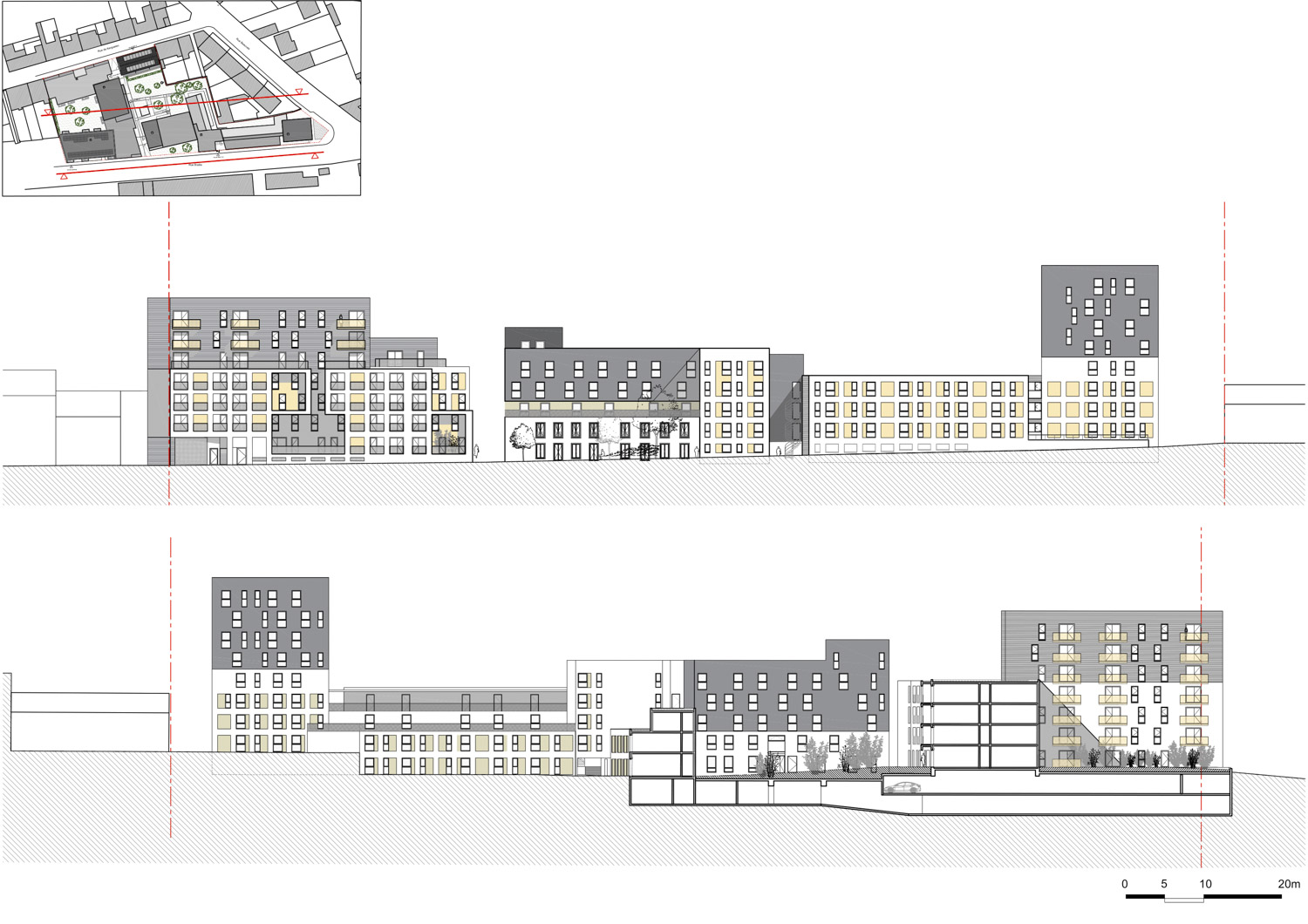 En revanche, les bâtiments donnant sur la Rue Braille s’élèvent jusqu’à R+8. Cette hauteur répond à leur situation face aux voies ferrées et dialogue avec les deux tours de l’autre côté de la gare, culminant à R+13.