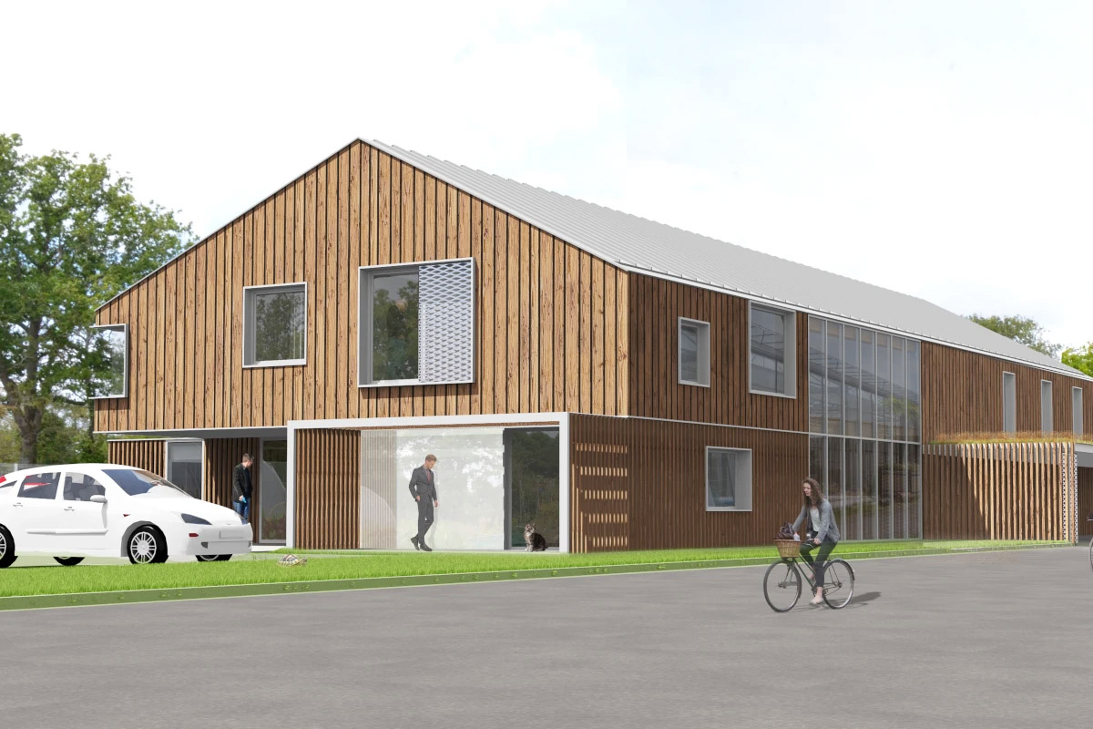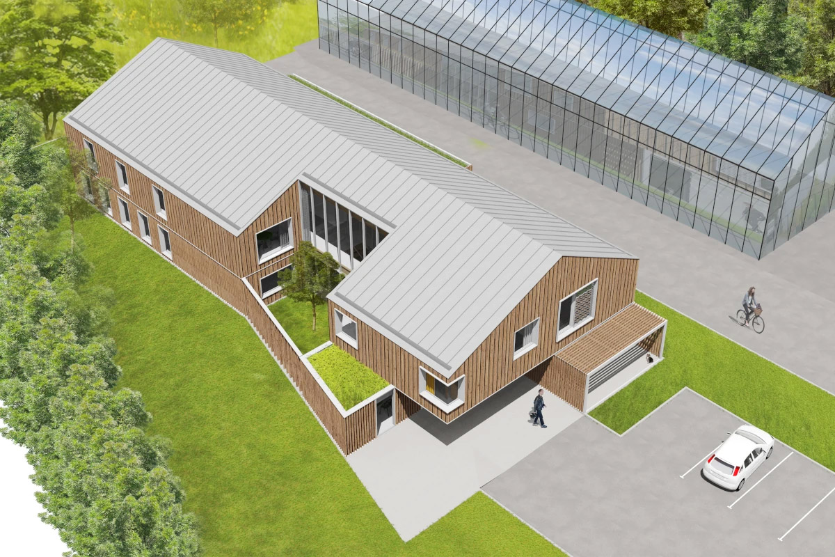 L’accès principal, orienté au Sud, donne directement sur l’entrée du site, via une placette. Un accès de service dédié aux livraisons et au personnel, est implanté à l’arrière du bâtiment, coté serre.