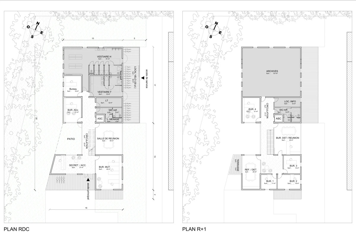 Le bâtiment des services techniques vient s’implanter à coté d’une serre existante sur site. Le gabarit du nouveau bâtiment de bureaux vient mimer cette dernière. Coté Est, il dialogue avec l’existant par un jeu de miroir et de transparence. A l’Ouest, le bâtiment plus fermé se déforme pour s’aligner avec la rue.